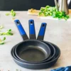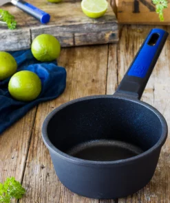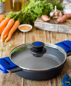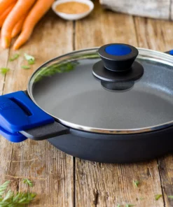 La Batería Advanced incluye todo lo que necesitas: una cacerola baja de 28 cm, su tapa, una cacerola alta de 24 cm con su tapa correspondiente y un cazo de 16 cm. Para mayor comodidad, también recibirás 2 packs de asas de silicona en color azul, perfectas para manipular tus cacerolas sin el riesgo de quemaduras.
