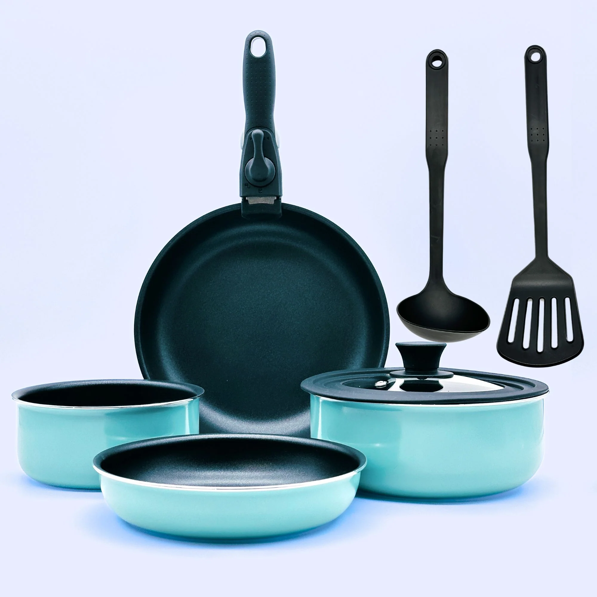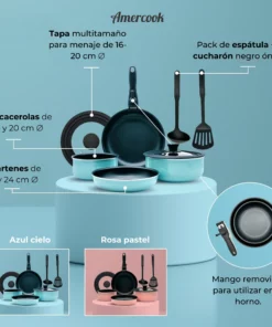 Este set incluye dos cacerolas (16 cm y 20 cm), dos sartenes (20 cm y 24 cm) y un juego de utensilios de cocina, esenciales para cualquier chef. Su diseño compacto permite apilar las piezas, maximizando el espacio en tu cocina, y su tapa de cristal adaptable ofrece versatilidad sin igual.