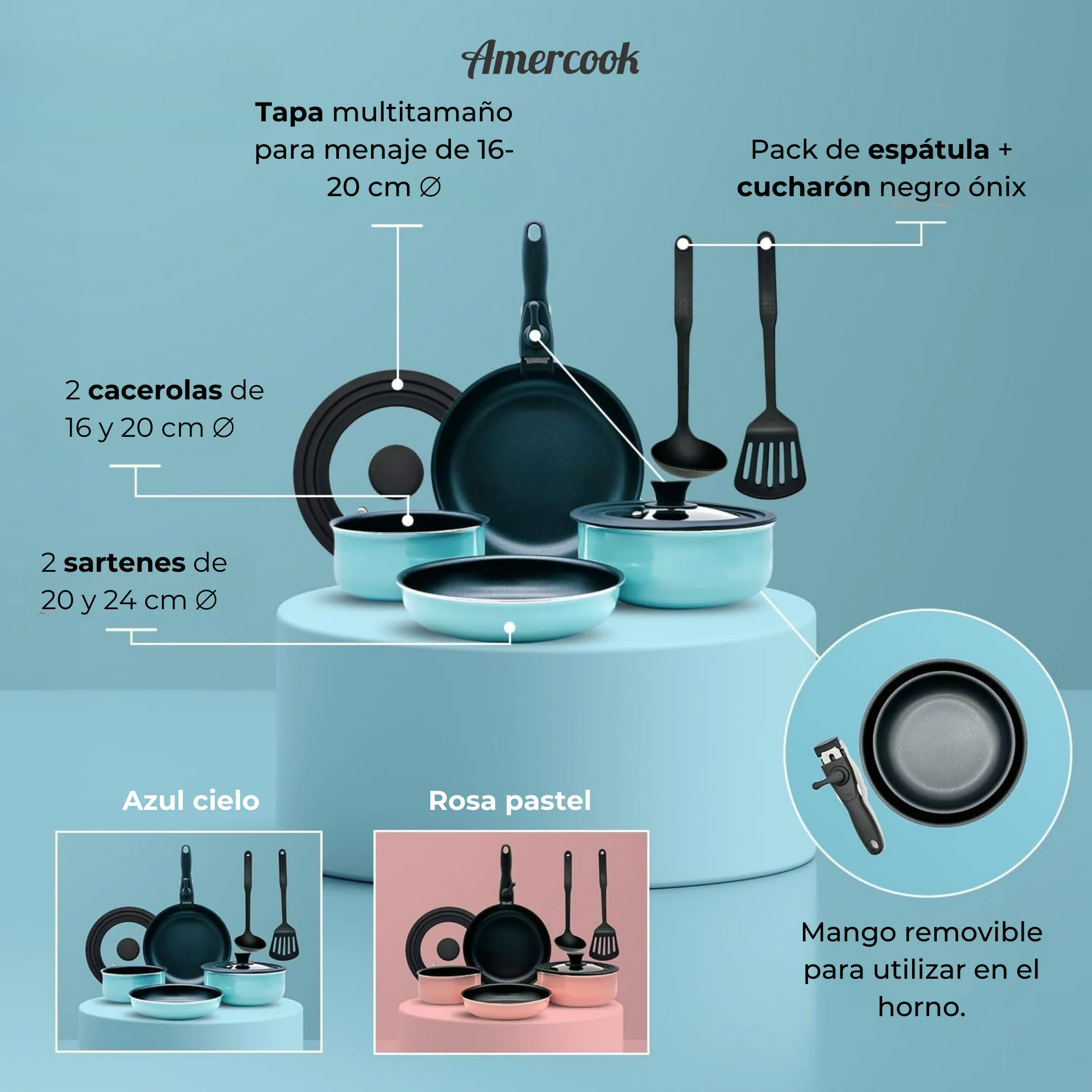 ¡Y eso no es todo! Esta batería es adecuada para todos los tipos de fuegos, incluidos gas, eléctrico, vitrocerámica e inducción. Además, su mango extraíble facilita el uso en el horno y en freidoras de aire, dándote más opciones creativas. Haz que cocinar sea un placer y elige un producto seguro y ecológico que cuida de tu familia y del planeta. ¡Descubre la magia de cocinar con estilo y sin compromisos!