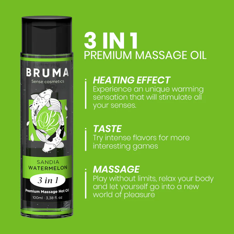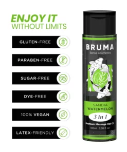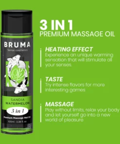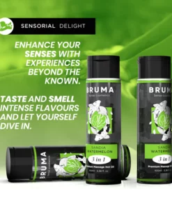 El Aceite de Masaje Premium Efecto Calor sabor Sandía de BRUMA es el compañero perfecto para tus momentos de relax y conexión íntima. En un elegante envase de 100 ml, este aceite transforma cada masaje en una experiencia única y seductora.
