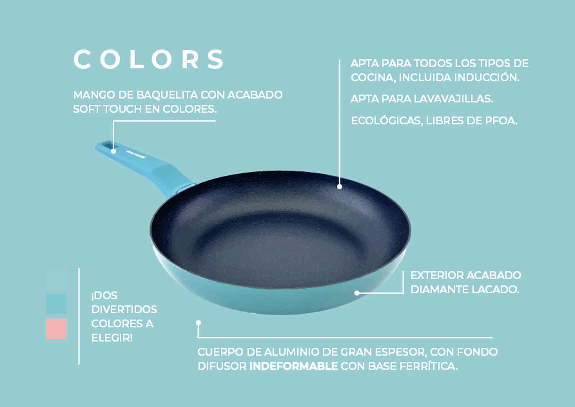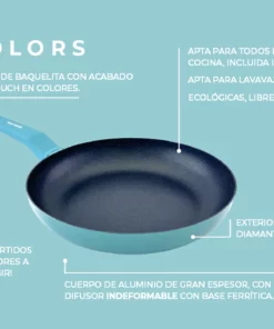 La colección COLORS combina estilo y funcionalidad, permitiéndote preparar platos saludables y creativos con un toque de color. Su base de aluminio de gran espesor asegura una cocción uniforme, mientras que su avanzado recubrimiento antiadherente facilita la limpieza y prolonga la vida útil del producto.