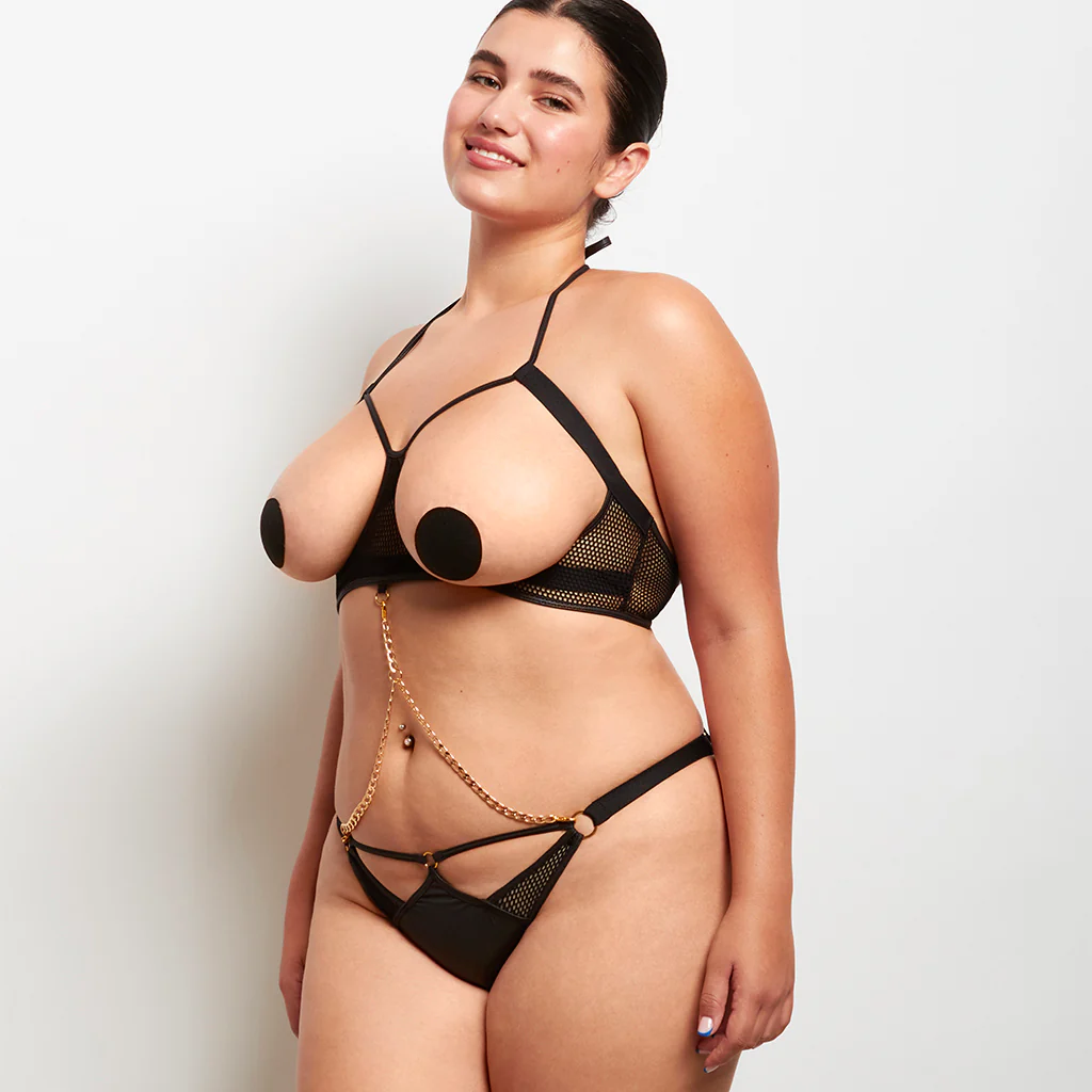 El top de rejilla se une a la braga mediante una cadena extraíble que añade un detalle audaz y glamuroso. Elaborado con materiales de alta calidad, el conjunto es 100% vegano, lo que significa que no solo te verás increíble, sino que también sentirás el orgullo de vestir una prenda eco-amigable.