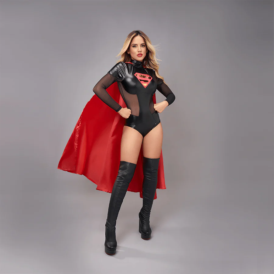 - Incluye: Un espectacular body y una capa que realzarán tu look de Super Chica.
