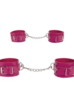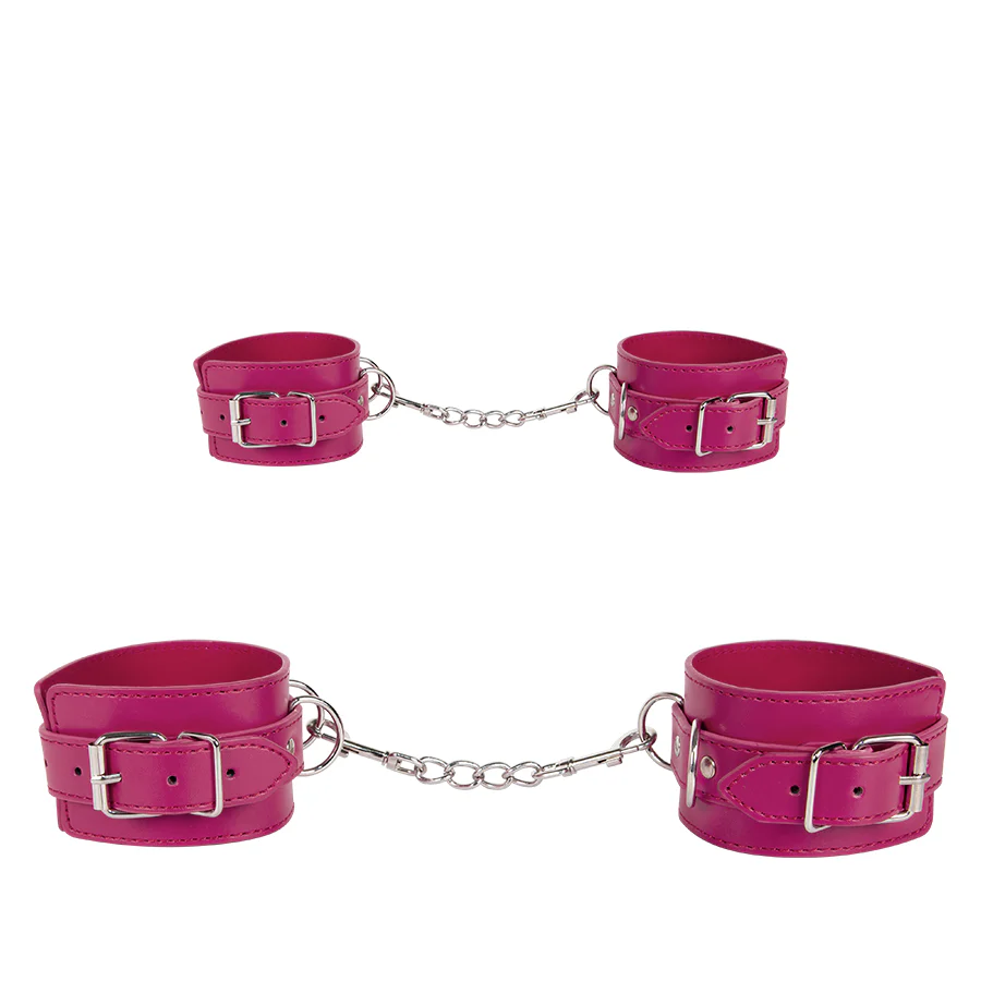Hecho de cuero sintético de alta calidad, nuestro Kit Domination no solo es seguro para tu piel, sino que también es eco-amigable. ¡Así que puedes jugar con confianza y sin preocupaciones! Las esposas están disponibles en un vibrante color magenta que seguramente capturará la atención y le dará un toque divertido a tus juegos de pareja.