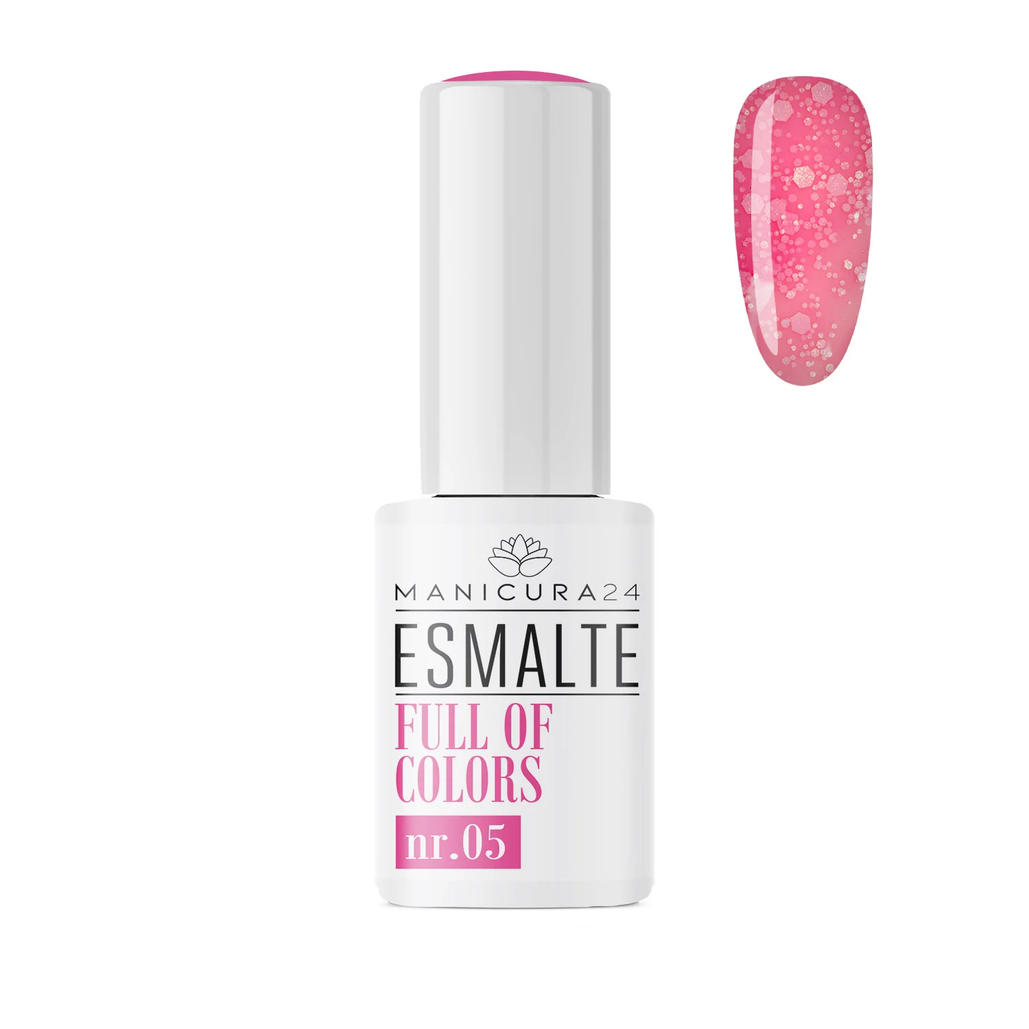 ¡Descubre el Esmalte permanente FULL OF COLORS – nr 05! Este esmalte único combina la frescura de un rosa translúcido flúor con un brillo espectacular de purpurina blanca en diferentes tamaños. Cada aplicación trae consigo un toque mágico que hará que tus uñas resalten y deslumbren.