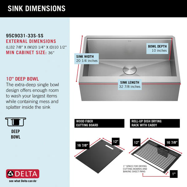 ¡Transforma tu cocina con el fregadero Workstation Apron de Delta! Este fregadero de acero inoxidable 304 de 16-gauge es la combinación perfecta de estilo y funcionalidad para cualquier hogar moderno. Con dimensiones de 32-7/8″ x 20-1/4″ x 10″, su diseño profundo te ofrece un amplio espacio para lavar y enjuagar tus utensilios con facilidad.