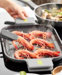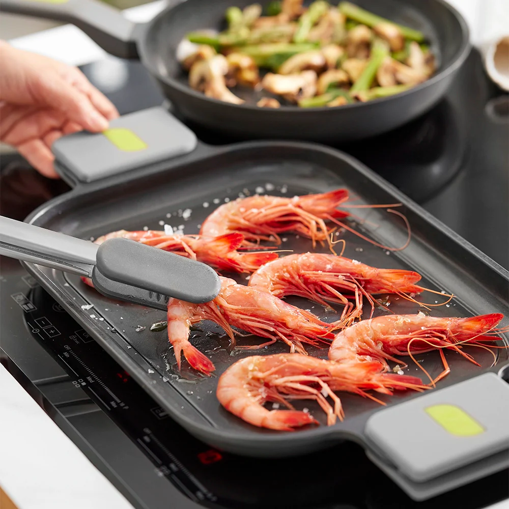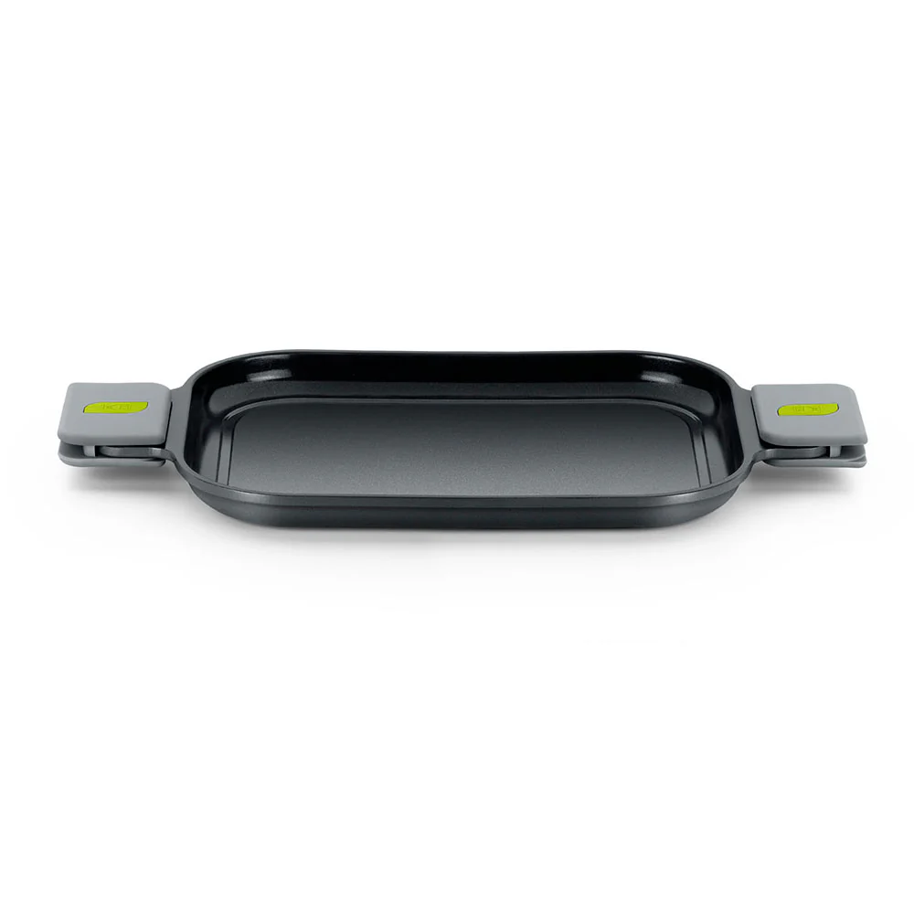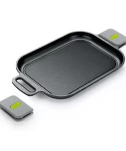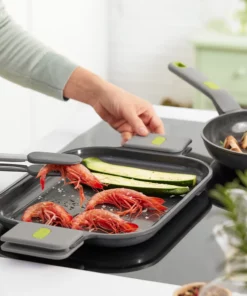 La **Parrilla Lisa Life** está diseñada para ser versátil; es adecuada para todo tipo de cocinas, incluyendo inducción, y su fondo difusor garantiza una distribución óptima del calor para un ahorro energético significativo. Con asas desmontables en un moderno color gris con detalles verdes, tendrás un agarre seguro y cómodo mientras cocinas tus platos favoritos, desde verduras a la parrilla hasta deliciosos postres.