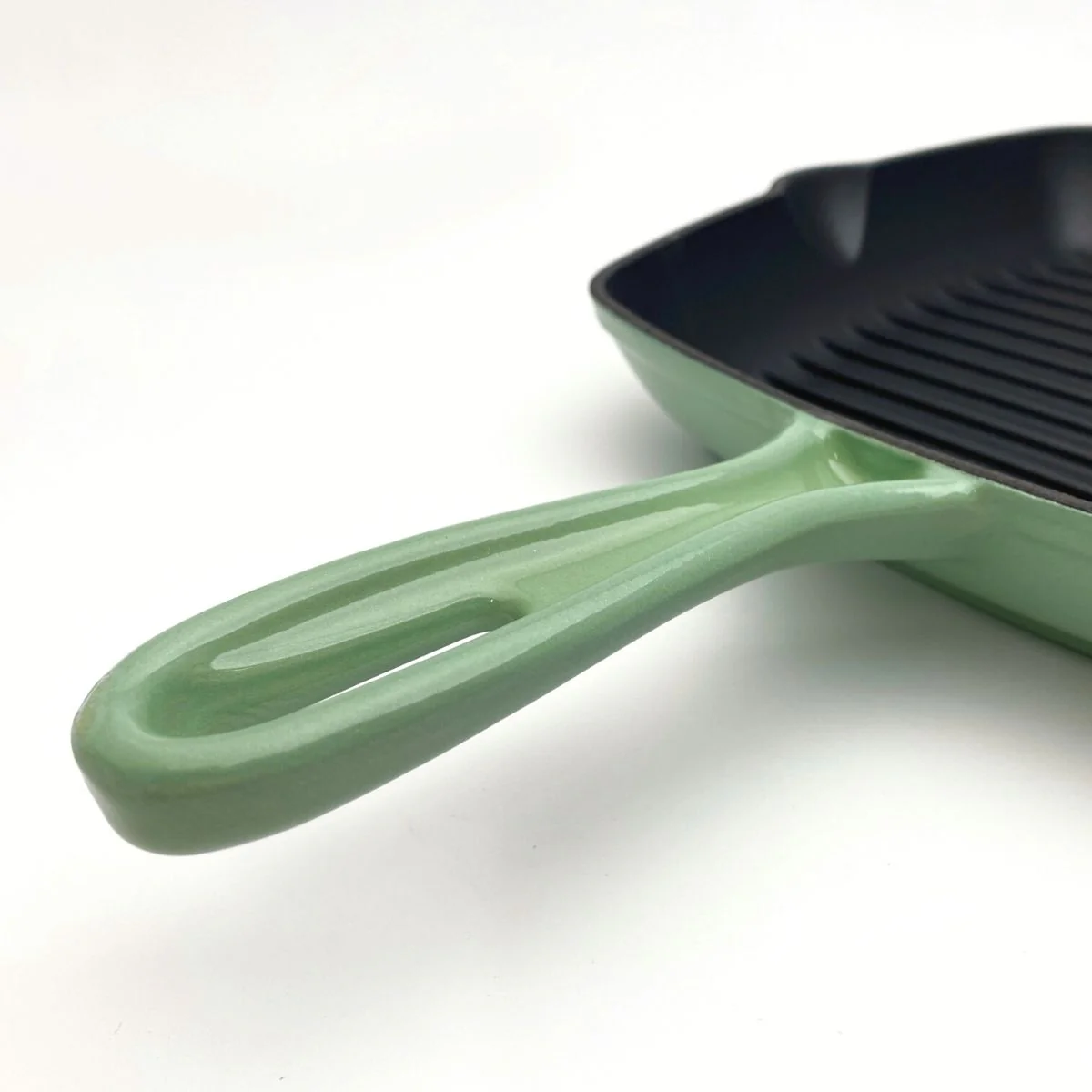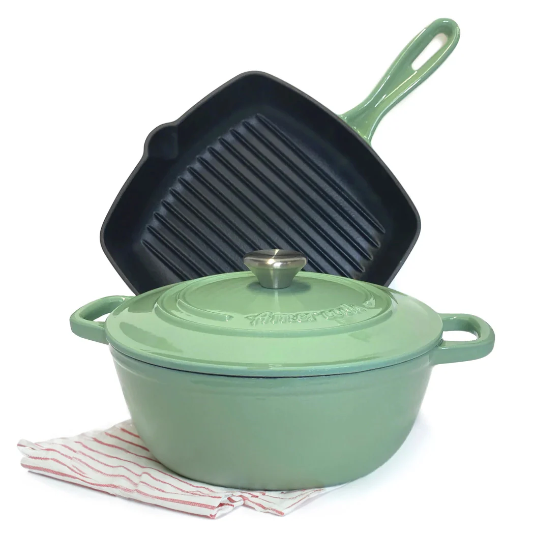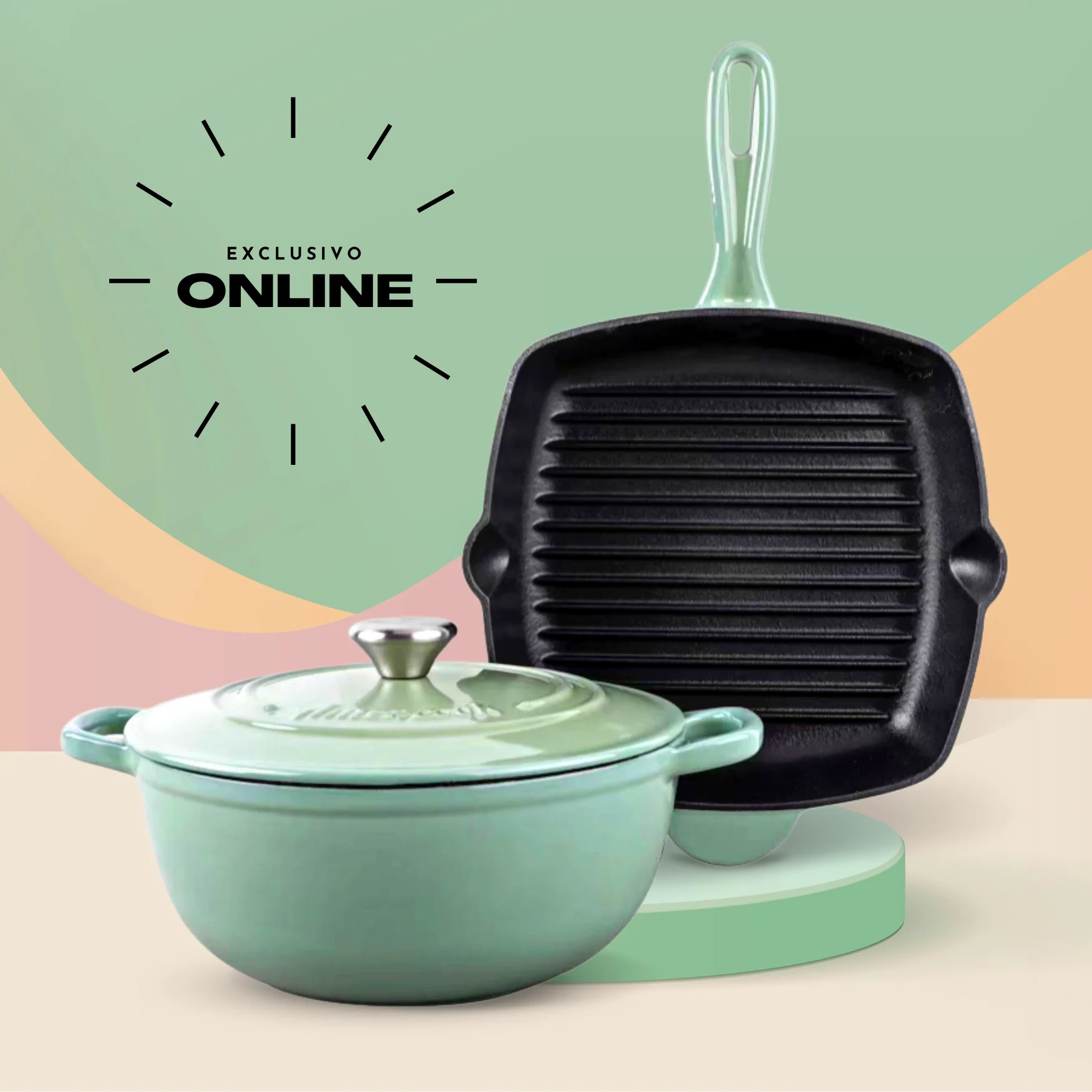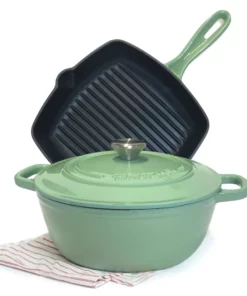 Set de grill y cacerola Cast Iron de hierro fundido verde turquesa, aptos para horno y todo tipo de cocinas. Este increíble set combina elegancia y funcionalidad, perfecto para los amantes de la cocina que buscan calidad y estilo en sus utensilios. Con un grill de 26 cm y una cacerola de 24 cm con tapa, este dúo es ideal para preparar deliciosas comidas para toda la familia.