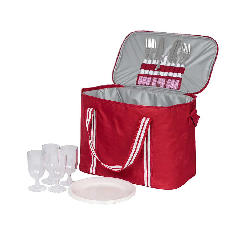 En la tapa superior encontrarás todo lo necesario para un picnic perfecto: 4 platos, 4 copas, 1 abridor de botellas, 4 cuchillos y 4 tenedores de acero inoxidable. Todos los implementos son de plástico resistente, combinando durabilidad y estilo.