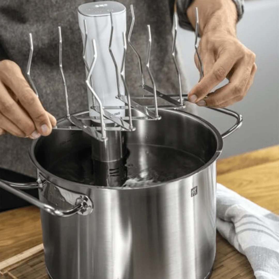 Gracias a sus 4 ranuras de tamaño generoso, podrás sumergir varias bolsas de vacío simultáneamente sin preocuparte de que floten. ¡Dile adiós a la preocupación! Con esta rejilla ajustable, se adapta a diferentes tamaños de ollas, permitiéndote cocinar una variedad de recetas con la técnica sous vide que tanto adoras.