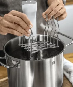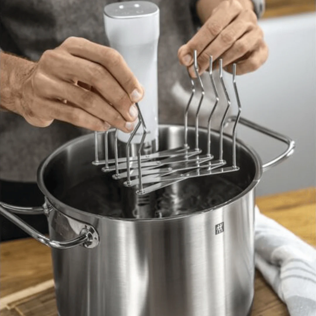 Transforma tu experiencia culinaria con la rejilla Sous Vide Zwilling, el accesorio indispensable para llevar tus platos al siguiente nivel. Diseñada meticulosamente en acero inoxidable a prueba de óxido, esta rejilla no solo asegura una cocción perfecta, sino que también es eco-amigable y segura para toda la familia.